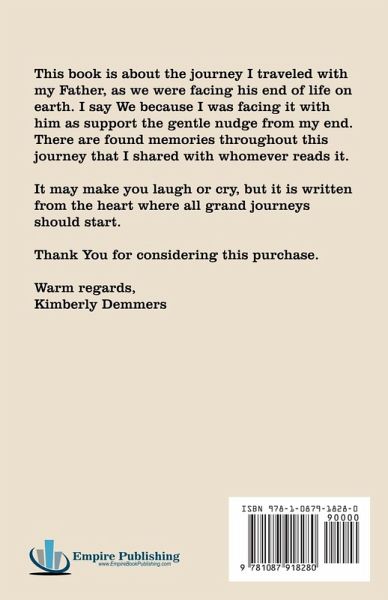 This book is about the journey I traveled with my Father, as we were facing his end of life on earth. I say We because I was facing it with him as support the gentle nudge from my end. There are found memories throughout this journey that I shared with whomever reads it. It may make you laugh or cry, but it is written from the heart where all grand journeys should start. Thank You for considering this purchase. Warm regards, Kimberly Demmers I choose to begin this book of my Dad by starting at the end. My Dad died on Apr 27, 2018. It was a long journey with him, and I. He had lived a long time, and his death has started a new journey for me, with the writing of this book. The day he transitioned back to spirit, was such a multitude of feelings and emotions, not just for me but for my daughter, and all who traveled with us throughout it.
