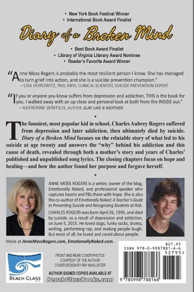 THE FUNNIEST, MOST POPULAR KID IN SCHOOL, Charles Aubrey Rogers suffered from depression and later addiction, then ultimately died by suicide. Diary of a Broken Mind focuses on the relatable story of what led to his suicide at age twenty and answers the why behind his addiction and this cause of death, revealed through a mother's story and years of Charles' published and unpublished song lyrics. The closing chapters focus on hope and healing-and how the author found her purpose and forgave herself. Diary of a Broken Mind is a poignant and powerful story written with telling detail and searing honesty-and hope. It is an inside look at the issues of depression, addiction, and suicide affecting so many families. It is a book that won't easily be forgotten.
