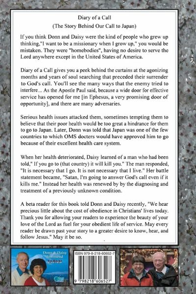 If you think Donn and Daisy were the kind of people who grew up thinking, "I want to be a missionary when I grow up," you would be mistaken. They were "homebodies," having no desire to serve the Lord anywhere except in the United States of America. Diary of a Call gives you a peek behind the curtains at the agonizing months and years of prayer and soul searching that preceded their surrender to God's Call. You'll see the many ways the enemy tried to interfere... As the Apostle Paul said, because a wide door for effective service has opened to me [in Ephesus, a very promising door of opportunity], and there are many adversaries. Serious health issues attacked them, sometimes tempting them to believe their poor health would be too great a hindrance for them to go Japan. Later, Donn was told that Japan was one of the few countries to which OMS doctors would have approved him to go because of their excellent health care system. When her health deteriorated, Daisy learned of a man who had been told, "If you go to (that country), it will kill you." The man responded, "It is necessary that I go. It is not necessary that I live." Her battle statement became, "Satan, I'm going to answer God's call even if it kills me." Instead, her health was renewed by the diagnosing and treatment of a previously unknown condition.A beta reader for this book told Donn and Daisy recently, "We hear precious little about the cost of obedience in Christian's lives today. Thank you for allowing your readers to experience the beauty of your love for the Lord as fuel for your obedient life of service. May every reader be drawn past your story to a greater desire to know, hear, and follow Jesus." May it be so.