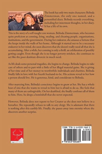 The book has only two main characters: Belinda Zimmerman, the only one named, and a personified diary. Belinda records everything, including her innermost thoughts, in her diary. It has a life of its own. This is the story of a self-taught con woman, Belinda Zimmerman, who becomes quite proficient at conning, lying, stealing, and cheating people, organizations, institutions, and the government. During her endeavor, she amasses a fortune that she keeps inside the walls of her home. Although it started out to be a necessary endeavor in her mind, she soon discovers that she doesn't really need all that she is accumulating. After a while, her conning is only a thrill, an exhilaration of possibly getting caught. Even though she is no longer poverty stricken, she continues to act like the poor destitute divorcée in much need. As life deals some personal tragedies, she begins to change. Belinda begins to take care of others and to part with a little of her illegal material gains. She is giving of her time and of her money to worthwhile individuals and charities. Belinda finally falls in love with her fourth husband-to-be. His actions reveal to her how a person should live. He is generous, kind, and considerate to Belinda. After marrying him, Belinda's conscience begins to gnaw at her. She has a whole host of sins that she wants to reveal to him but is afraid to do so. She feels that many of them are unforgivable. On her deathbed, she finally confesses all of them to him. Here, he drops a bombshell that she never expected. However, Belinda does not repent to her Creator as she does not believe in a hereafter. She repeatedly refuses to talk to any clergy. She is adamant that there is nothing after this earthly life. Finally, she passes away into eternity where she discovers another surprise.