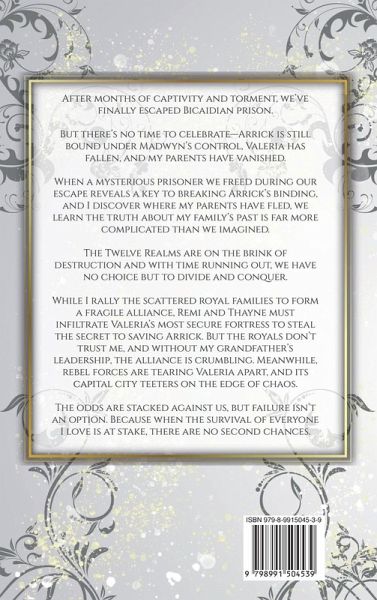 After months of captivity and torment, we've finally escaped Bicaidian prison. But there's no time to celebrate-Arrick is still bound under Madwyn's control, Valeria has fallen, and my parents have vanished. When a mysterious prisoner we freed during our escape reveals a key to breaking Arrick's binding, and I discover where my parents have fled, we learn the truth about my family's past is far more complicated than we imagined. The Twelve Realms are on the brink of destruction and with time running out, we have no choice but to divide and conquer. While I rally the scattered royal families to form a fragile alliance, Remi and Thayne must infiltrate Valeria's most secure fortress to steal the secret to saving Arrick. But the royals don't trust me, and without my grandfather's leadership, the alliance is crumbling. Meanwhile, rebel forces are tearing Valeria apart, and its capital city teeters on the edge of chaos. The odds are stacked against us, but failure isn't an option. Because when the survival of everyone I love is at stake, there are no second chances.