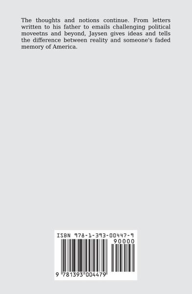 The thoughts and notions continue. From letters written to his father to emails challenging political moveetns and beyond, Jaysen gives ideas and tells the difference between reality and someone's faded memory of America.