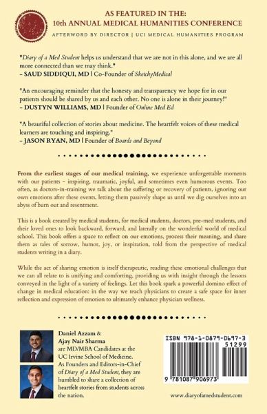 From the earliest stages of our medical training, we experience unforgettable moments with our patients - inspiring, traumatic, joyful, and sometimes even humorous events. Too often, as doctors-in-training we talk about the suffering or recovery of our patients, ignoring our own emotions after these events, letting them passively shape us until we dig ourselves into an abyss of burn out and resentment. Diary of a Med Student is a book created by medical students, for medical students, doctors, pre-med students, and their loved ones to look backward, forward, and laterally on the wonderful world of medical school. This book offers a space to reflect on our emotions, process their meaning, and share them as tales of sorrow, humor, joy, or inspiration, told from the perspective of medical students writing in a diary. While the act of sharing emotion is itself therapeutic, reading these emotional challenges that we can all relate to is unifying and comforting, providing us with insight through the lessons conveyed in the light of a variety of feelings. Let this book spark a powerful domino effect of change in medical education: in the way we teach physicians to create a safe space for inner reflection and expression of emotion to ultimately enhance physician wellness.
