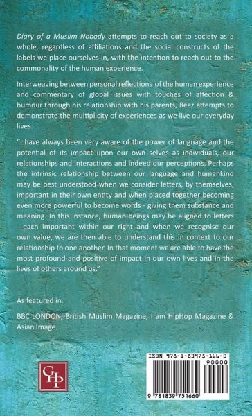 Diary of a Muslim Nobody attempts to reach out to society as a whole, regardless of affiliations and the social constructs of the labels we place ourselves in, with the intention to reach out to the commonality of the human experience. Interweaving between personal reflections of the human experience and commentary of global issues with touches of affection & humour through his relationship with his parents, Reaz attempts to demonstrate the multiplicity of experiences as we live our everyday lives. "I have always been very aware of the power of language and the potential of its impact upon our own selves as individuals, our relationships and interactions and indeed our perceptions. Perhaps the intrinsic relationship between our language and humankind may be best understood when we consider letters, by themselves, important in their own entity and when placed together becoming even more powerful to become words - giving them substance and meaning. In this instance, human beings may be aligned to letters - each important within our right and when we recognise our own value, we are then able to understand this in context to our relationship to one another. In that moment we are able to have the most profound and positive of impact in our own lives and in the lives of others around us." As featured by: BBC LONDON, British Muslim Magazine, I am HipHop Magazine & Asian Image.