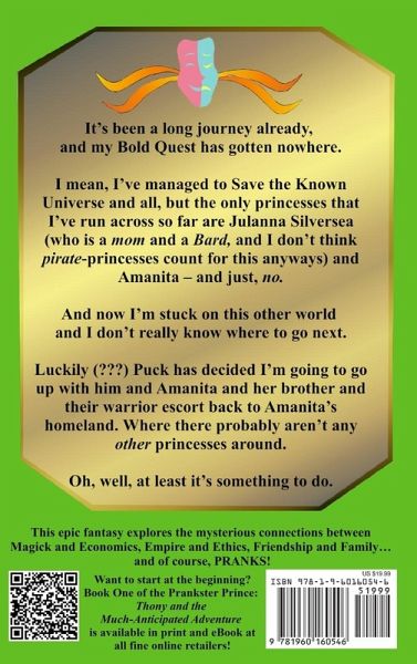 Prince Thony and his friends have saved all the worlds in the universe - now he needs to get back to his Bold Quest to find a princess to marry (with a wealthy and powerful father so he can bring troops back home to save his land. But first he has to visit Amanita's homeland... where they don't like guys too much ********** It's been a long journey already, and my Bold Quest has gotten nowhere. I mean, I've managed to Save the Known Universe and all, but the only princesses that I've run across so far are Julanna Silversea (who is a mom and a Bard, and I don't think pirate-princesses count for this anyways) and Amanita - and just, no. And now I'm stuck on this other world and I don't really know where to go next. Luckily (???) Puck has decided I'm going to go up with him and Amanita and her brother and their warrior escort back to Amanita's homeland. Where there probably aren't any other princesses around. Oh, well, at least it's something to do. ******** This epic fantasy explores the mysterious connections between Magick and Economics, Empire and Ethics, Friendship and Family... and of course, PRANKS! Want to start at the beginning? Book One of the Prankster Prince: Thony and the Much-Anticipated Adventure is available in print and eBook at all fine online retailers! ******** Teaser: Day 20 of our journey So, today Amanita was in a total grump and everyone tried to avoid her while we rode along what someone has finally explained is called the 'Tea Road.' Apparently, that's the name because the best tea is grown in that Darjil place where Valderon Raven'sWing enchanted the whole populace, and then it's transported up here for sale around the world. Getting hold of a map has been nearly as hard as getting hold of a calendar. And, honestly, I could probably just ask, and someone would show me one or explain, or something. But there hasn't been much of an opportunity to ask anyone. Commander Zaja likes it quiet at meals, and nobody goes against her. And I really want to see this stuff written down, so asking while we're riding is probably not a good idea; I haven't tried reading while riding yet, but my stomach gets tickly in a bad way, just thinking about it. Though Puck does it all the time, since Chillabiaen doesn't need direction any more than Twinklestar does. Hunh. Which means if I could get over my guts, I could probably do it. Anyways, I'm going to try talking to Daffyd in a few minutes. If we whisper, maybe I can get some more details of what's going on out of him. He seems to know what's going on, but when he tried to explain last night, we got those girl-guards pounding on the door and telling us to 'quiet down.' Nanny-goats, all of them.