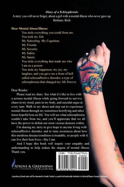 She spiraled into a terrifying abyss of mental illness at age 13, and now in her thirties, Bethany Boik offers a disturbing and uplifting peek into the personal hell she has suffered and survived.In Diary of a Schizophrenic, Bethany's poetry, journal entries and letters offer graphic details and insights into the mind, body and life of a teenager and young woman who loses control of herself, causing chaos in her schoolwork, friendships and family relationships. Told through the lens of a woman stalked by suicidal urges, but determined to defeat her demons, this gripping memoir aims to educate people about schizoaffective disorder, while providing hope to those diagnosed with it, that they, too, can find peace and live a fulfilling life.Bethany describes psychotic episodes that landed her in clinics and hospitals; the stays were difficult but they helped her get the treatment she needed to stabilize her mental health. Describes the long list of pharmaceutical drugs she has taken for schizoaffective disorder, PTSD, ADHD, and other ailments.Bethany also shares the beautiful blessings of friends, teachers, clinicians, her "found family" and her grandmother who provided the support she needed-emotionally, financially, medically and academically.Bethany Boik is a powerful testament to the power of a strong will to survive despite horrific voices and visions in her mind telling her to end her life.This book will open your mind and heart to the struggles and the successes of this courageous young woman who's on a mission to help destigmatize mental illness and inspire those who suffer with it to live their best lives.