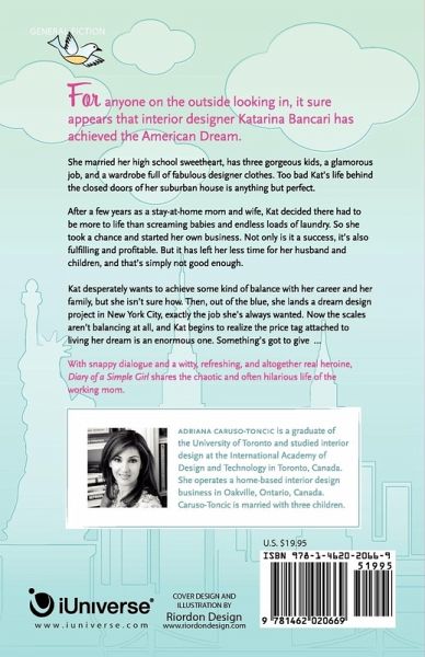 For anyone on the outside looking in, it sure appears that interior designer Katarina Bancari has achieved the American Dream. She married her high school sweetheart, has three gorgeous kids, a glamorous job, and a wardrobe full of fabulous designer clothes. Too bad Kat's life behind the closed doors of her suburban house is anything but perfect. After a few years as a stay-at-home mom and wife, Kat decided there had to be more to life than screaming babies and endless loads of laundry. So she took a chance and started her own business. Not only is it a success, it's also fulfilling and profitable. But it has left her less time for her husband and children, and that's simply not good enough. Kat desperately wants to achieve some kind of balance with her career and her family, but isn't sure how. Then, out of the blue, she lands a dream design project in New York City, exactly the job she's always wanted. Now the scales aren't balancing at all, and Kat begins to realize the price tag attached to living her dream is an enormous one. Something's got to give ... With snappy dialogue and a witty, refreshing, and altogether real heroine, Diary of a Simple Girl shares the chaotic and often hilarious life of the working mom.