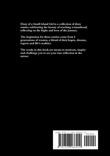 Diary of a Small Island Girl is a collection of diary entries celebrating the beauty of reaching womanhood, reflecting on the highs and lows of the journey. The inspiration for these entries come from 5 generations of women, a blend of their hopes, dreams, regrets and life's realities. The words in this book are meant to motivate, inspire and challenge you to see your true reflection in the mirror.