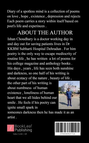 Diary of a spotless mind is a collection of poems on love , hope , existence , depression and rejects . Each poem carries a story within itself based on poet's life and experiences .