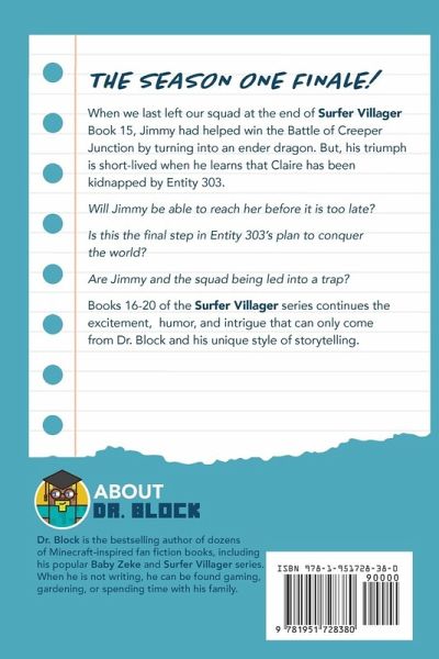 Books 16-20 all-in-one collection! The Season One Finale! When we last left our squad at the end of Book 15, Jimmy had helped win the Battle of Creeper Junction by turning into an ender dragon. But, his triumph is short-lived when he learns that Claire has been kidnapped by Entity 303. Will Jimmy be able to reach her before it is too late? Is this the final step in Entity 303's plan to conquer the world? Are Jimmy and the squad being led into a trap? Read the book and find out what happens. At time of publication, the individual volumes of Books 16-20 had a combined 1100+ reviews and a 4.8+ out of 5 average on Goodreads. Act now and get books 16-20 of the Diary of a Surfer Villager Minecraft fanfiction series in a convenient, money-saving bundle.