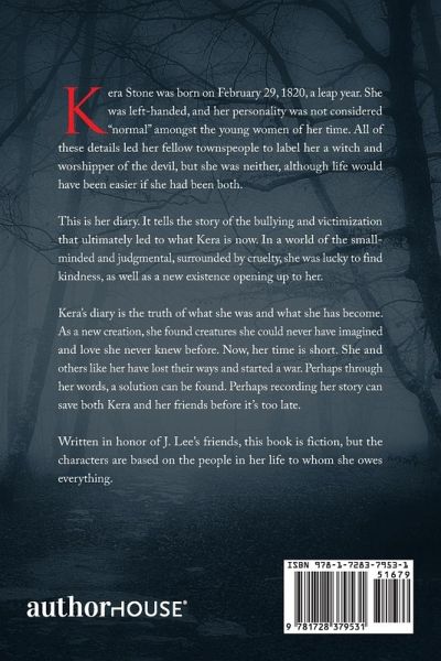 Kera Stone was born on February 29, 1820, a leap year. She was left-handed, and her personality was not considered "normal" amongst the young women of her time. All of these details led her fellow townspeople to label her a witch and worshipper of the devil, but she was neither, although life would have been easier if she had been both. This is her diary. It tells the story of the bullying and victimization that ultimately led to what Kera is now. In a world of the small-minded and judgmental, surrounded by cruelty, she was lucky to find kindness, as well as a new existence opening up to her. Kera's diary is the truth of what she was and what she has become. As a new creation, she found creatures she could never have imagined and love she never knew before. Now, her time is short. She and others like her have lost their ways and started a war. Perhaps through her words, a solution can be found. Perhaps recording her story can save both Kera and her friends before it's too late.