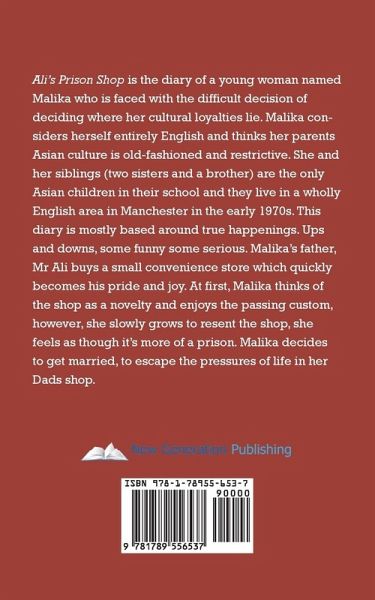 Ali's Prison Shop is the diary of a young woman named Malika who is faced with the difficult decision of deciding where her cultural loyalties lie. Malika considers herself entirely English and thinks her parents Asian culture is old-fashioned and restrictive. She and her siblings (two sisters and a brother) are the only Asian children in their school and they live in a wholly English area in Manchester in the early 1970s. This diary is mostly based around true happenings. Ups and downs, some funny some serious. Malika's father, Mr Ali buys a small convenience store which quickly becomes his pride and joy. At first, Malika thinks of the shop as a novelty and enjoys the passing custom, however, she slowly grows to resent the shop, she feels as though it's more of a prison. Malika decides to get married, to escape the pressures of life in her Dads shop.