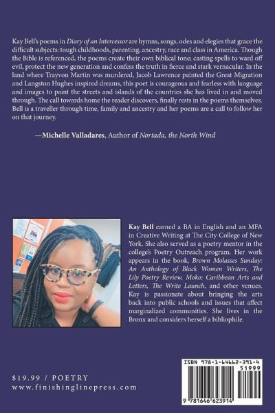 Kay Bell's poems in Diary of an Intercessor are hymns, songs, odes and elegies that grace the difficult subjects: tough childhoods, parenting, ancestry, race and class in America. Though the Bible is referenced, the poems create their own biblical tone; casting spells to ward off evil, protect the new generation and confess the truth in fierce and stark vernacular. In the land where Trayvon Martin was murdered, Jacob Lawrence painted the Great Migration and Langston Hughes inspired dreams, this poet is courageous and fearless with language and images to paint the streets and islands of the countries she has lived in and moved through. The call towards home the reader discovers, finally rests in the poems themselves. Bell is a traveller through time, family and ancestry and her poems are a call to follow her on that journey. -Michelle Valladares, Author of Nortada, the North Wind