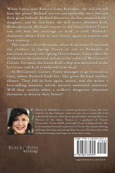 When Fancy sent Richard from Barbados, she did not tell him her plans. Richard arrives unexpectedly after she and Kirk go to Ireland. Richard discovers she has adopted Kirk's daughter, and he concludes she will never abandon Kirk. Brokenhearted, Richard returns to the future before Fancy can tell him her marriage to Kirk is void. Richard’s departure allows Kirk to woo Fancy again in earnest and they remarry. The couple sail to Bermuda, where Kirk leaves Fancy and the children at Spring Haven to sail to Barbados. A hurricane destroys the Spring Haven house. Fancy takes the children to the mainland and on to the safety of McCarron’s Corner. En route, she learns Kirk’s ship was destroyed in the hurricane and Kirk is believed to be dead. At McCarron’s Corner, Fancy manages to go forward in time, where Richard finds her. She gives Richard another chance. They fall in love again, marry, and she writes a best-selling memoir, which attracts unwanted attention. Will they survive when a stalker’s dangerous obsession threatens to destroy their future?