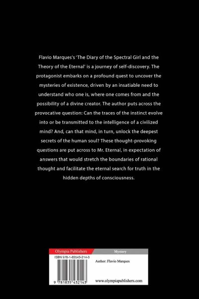Flavio Marques's 'The Diary of the Spectral Girl and the Theory of the Eternal' is a journey of self-discovery. The protagonist embarks on a profound quest to uncover the mysteries of existence, driven by an insatiable need to understand who one is, where one comes from and the possibility of a divine creator. The author puts across the provocative question: Can the traces of the instinct evolve into or be transmitted to the intelligence of a civilized mind? And, can that mind, in turn, unlock the deepest secrets of the human soul? These thought-provoking questions are put across to Mr. Eternal, in expectation of answers that would stretch the boundaries of rational thought and facilitate the eternal search for truth in the hidden depths of consciousness.