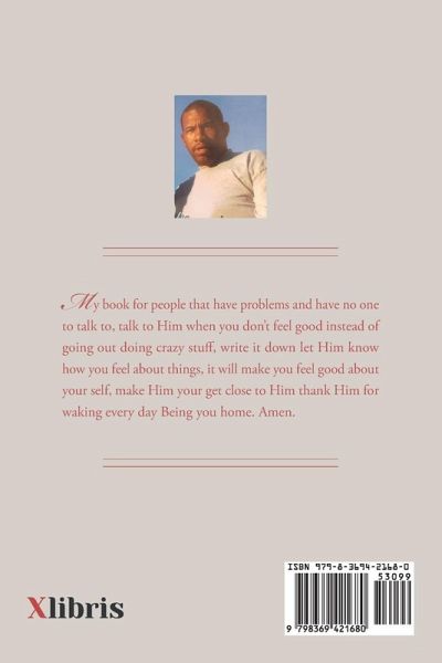 My book for people that have problems and have no one to talk to, talk to Him when you don't feel good instead of going out doing crazy stuff, write it down let Him know how you feel about things, it will make you feel good about your self, make Him your get close to Him thank Him for waking every day Being you home. Amen.
