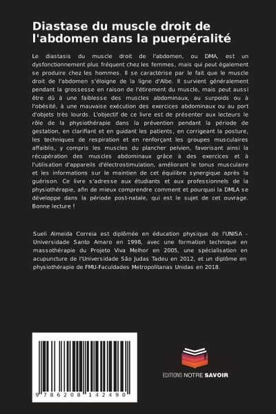 Le diastasis du muscle droit de l'abdomen, ou DMA, est un dysfonctionnement plus fréquent chez les femmes, mais qui peut également se produire chez les hommes. Il se caractérise par le fait que le muscle droit de l'abdomen s'éloigne de la ligne d'Albe. Il survient généralement pendant la grossesse en raison de l'étirement du muscle, mais peut aussi être dû à une faiblesse des muscles abdominaux, au surpoids ou à l'obésité, à une mauvaise exécution des exercices abdominaux ou au port d'objets très lourds. L'objectif de ce livre est de présenter aux lecteurs le rôle de la physiothérapie dans la prévention pendant la période de gestation, en clarifiant et en guidant les patients, en corrigeant la posture, les techniques de respiration et en renforçant les groupes musculaires affaiblis, y compris les muscles du plancher pelvien, favorisant ainsi la récupération des muscles abdominaux grâce à des exercices et à l'utilisation d'appareils d'électrostimulation, améliorant le tonus musculaire et les informations sur le maintien de cet équilibre synergique après la guérison. Ce livre s'adresse aux étudiants et aux professionnels de la physiothérapie, afin de mieux comprendre comment et pourquoi la DMLA se développe dans la période post-natale, qui est le sujet de cet ouvrage. Bonne lecture !