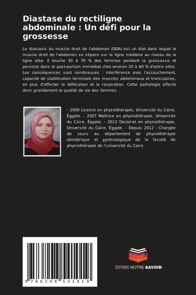 Le diastasis du muscle droit de l'abdomen (DDA) est un état dans lequel le muscle droit de l'abdomen se sépare sur la ligne médiane au niveau de la ligne alba. Il touche 30 à 70 % des femmes pendant la grossesse et persiste dans le post-partum immédiat chez environ 35 à 60 % d'entre elles. Les conséquences sont nombreuses : interférence avec l'accouchement, capacité de stabilisation terminale des muscles abdominaux et tronculaires, en plus d'affecter la défécation et la respiration. Cette pathologie affecte donc grandement la qualité de vie des femmes.