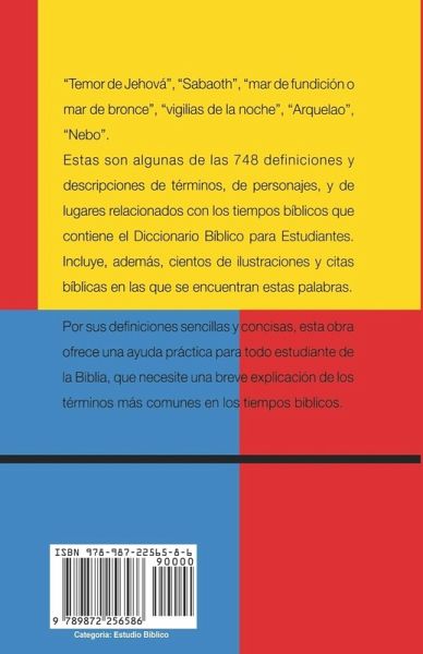 748 definiciones y descripciones de términos, de personajes, y de lugares relacionados con los tiempos bíblicos que contiene el Diccionario Bíblico para Estudiantes. Incluye, además, cientos de ilustraciones y citas bíblicas en las que se encuentran estas palabras. Por sus definiciones sencillas y concisas, esta obra ofrece una ayuda práctica para todo estudiante de la Biblia, que necesite una breve explicación de los términos más comunes en los tiempos bíblicos. 66pp. Paper.