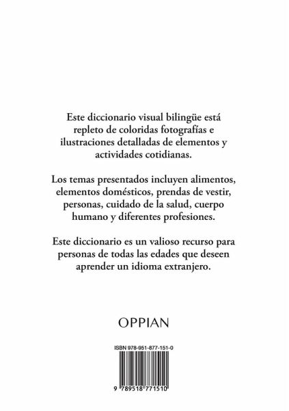 Este diccionario visual bilingüe está repleto de coloridas fotografías e ilustraciones detalladas de elementos y actividades cotidianas. Los temas presentados incluyen alimentos, elementos domésticos, prendas de vestir, personas, cuidado de la salud, cuerpo humano y diferentes profesiones. Este diccionario es un valioso recurso para personas de todas las edades que deseen aprender un idioma extranjero.