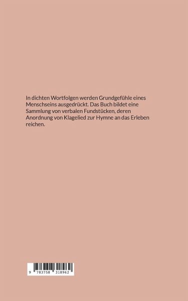 In dichten Wortfolgen werden Grundgefühle eines Menschseins ausgedrückt. Das Buch bildet eine Sammlung von verbalen Fundstücken, deren Anordnung von Klagelied zur Hymne an das Erleben reichen.