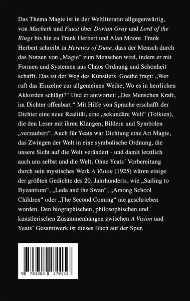 Das Thema Magie ist in der Weltliteratur allgegenwärtig, von Macbeth und Faust über Dorian Gray und Lord of the Rings bis hin zu Frank Herbert und Alan Moore. Frank Herbert schreibt in Heretics of Dune, dass der Mensch durch das Nutzen von "Magie" zum Menschen wird, indem er mit Formen und Systemen aus Chaos Ordnung und Schönheit schafft. Das ist der Weg des Künstlers. Goethe fragt: "Wer ruft das Einzelne zur allgemeinen Weihe, Wo es in herrlichen Akkorden schlägt?" Und er antwortet: "Des Menschen Kraft, im Dichter offenbart." Mit Hilfe von Sprache erschafft der Dichter eine neue Realität, eine "sekundäre Welt" (Tolkien), die den Leser mit ihren Klängen, Bildern und Symbolen "verzaubert". Auch für Yeats war Dichtung eine Art Magie, das Zwingen der Welt in eine symbolische Ordnung, die unsere Sicht auf die Welt verändert - und damit letztlich auch uns selbst und die Welt. Ohne Yeats´ Vorbereitung durch sein mystisches Werk A Vision (1925) wären einige der größten Gedichte des 20. Jahrhunderts, wie "Sailing to Byzantium", "Leda and the Swan", "Among School Children" oder "The Second Coming" nie geschrieben worden. Den biographischen, philosophischen und künstlerischen Zusammenhängen zwischen A Vision und Yeats´ Gesamtwerk ist dieses Buch auf der Spur.