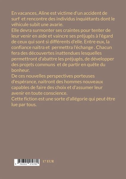 En vacances, Aline est victime d'un accident de surf et rencontre des individus inquiétants dont le véhicule subit une avarie. Elle devra surmonter ses craintes pour tenter de leur venir en aide et vaincre ses préjugés à l'égard de ceux qui sont différents d'elle. Entre eux et elle, la confiance naitra et permettra l'échange . Chacun fera des découvertes inattendues lesquelles permettront d'abattre les préjugés, de développer des projets communs. et de partir en quête du bonheur. De ces nouvelles perspectives porteuses d'espérance, naitront des hommes nouveaux capables de faire des choix et d'assumer leur avenir en toute conscience. Cette fiction est une sorte d'allégorie qui peut être lue par tous.