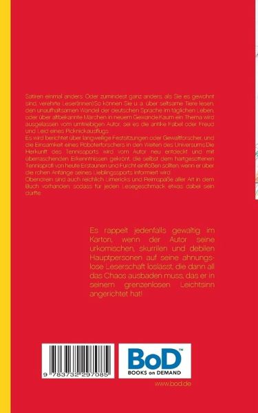 Satiren einmal anders: Oder zumindest ganz anders, als Sie es gewohnt sind, verehrte Leser(innen): So können Sie u. a. über seltsame Tiere lesen, den unaufhaltsamen Wandel der deutschen Sprache im täglichen Leben, oder über altbekannte Märchen in neuem Gewande. Kaum ein Thema wird ausgelassen vom umtriebigen Autor, sei es die antike Fabel oder Freud und Leid eines Picknickausflugs. Es wird berichtet über langweilige Festsitzungen oder Gewaltforscher, und die Einsamkeit eines Roboterforschers in den Weiten des Universums. Die Herkunft des Tennissports wird vom Autor neu entdeckt und mit überraschenden Erkenntnissen gekrönt, die selbst dem hartgesottenen Tennisprofi von heute Erstaunen und Furcht einflößen sollten, wenn er über die rohen Anfänge seines Lieblingssports informiert wird ... Obendrein sind auch reichlich Limericks und Reimspäße aller Art in dem Buch vorhanden, sodass für jeden Lesegeschmack etwas dabei sein dürfte. Auch Lehrgeschichten a la Bertold Brecht sind nicht ausgespart, mitunter mit kuriosem Wahrheitsgehalt und seltsam anmutenden Dialogen, zugegeben, aber durchaus unbrauchbar und völlig überflüssig. Oder wenn gar Kommissar Derrick mit Sherlock Watson und Dr. Holmes zusammentrifft, dann ist der Teufel los, denn dann ist das perfekte Chaos einfach vorprogrammiert, und Kommissar Kellers Erben sind dazu verdammt, im ewigen Ermittlungssumpf zu versinken. Gekrönt wird das Ganze dann nur noch von Schneewittchen und dem bösen Wolf, die beide nicht zum ewig pennenden Dornröschen durchdringen können, weil sie unterwegs von einer rassistischen Rasselbande aufgehalten werden, die die Verleihung des großen Paleidos-Ordens aufhalten will, weil ein alter Mann nicht mehr mit seinen Meerschweinchen fertig wird, weil diese lieber bei Herrn Bäumer wohnen wollen ...!!! Doch nein, halt! Bringen wir hier letzten Endes nicht irgendetwas gewaltig durcheinander? Ach du Schreck! Na, macht nichts, es rappelt jedenfalls gewaltig im Karton, wenn der Autor seine urkomischen, skurrilen und debilen Hauptpersonen auf seine ahnungslose Leserschaft loslässt, die dann all das Chaos ausbaden muss, das er in seinem grenzenlosen Leichtsinn angerichtet hat!