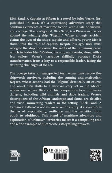 ""Dick Sand: A Captain at Fifteen"" is an enthralling adventure novel by Jules Verne, celebrated for its compelling narrative and vivid portrayal of maritime life. The story follows the young protagonist, Dick Sand, who finds himself thrust into a perilous journey when his ship, the ""Pilgrim,"" is wrecked off the coast of Africa. Despite his youth, Dick demonstrates remarkable courage and leadership as he takes charge of the survivors and navigates the treacherous waters of the African continent. Along the way, he encounters a diverse cast of characters, including the enigmatic Negoro and the benevolent Captain Hull. As Dick and his companions embark on a quest for survival and redemption, they face a series of challenges, including encounters with wild animals, hostile natives, and the forces of nature. With its blend of action, suspense, and moral complexity, ""Dick Sand: A Captain at Fifteen"" offers readers a thrilling and thought-provoking adventure that explores the themes of courage, resilience, and the human spirit.