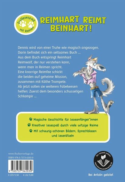 Aus dem Buch entspringt Reimhart, der Reimwolf. Er ist eigentlich ein Werwolf, der nur verstehen kann, wenn man in Reimen spricht. Eine knorrige Reimfee schickt die beiden auf eine geheime Mission. Zusammen mit Käthe Trompete müssen sie weiteren buchgebundenen Fabelwesen helfen: Zuerst dem besonders schusseligen Schlampir, der in seiner Ekelgruft sein Gebiss verloren hat ...