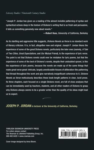 Dickens Novels as Verse adds to Dickens criticism by being unlike most Dickens criticism. It argues that some of the great Dickens novels are held together by book-length patterns in topics that, by organizing the object in dimensions extra to syntax, make readers' experience feel truer than it would otherwise feel.