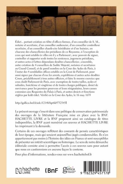 Édict... portant création en tiltre d'offices formez, d'un conseiller de S. M., notaire et secrétaire, d'un conseiller audiencier, d'un conseiller controlleur secrétaire, d'un conseiller chaufe-cire héréditaire et d'un huissier, en chacune des chancelleries des présidiaux de ce Royaume, à l'exception de ceux qui sont establis ès villes où il y a Parlement; avec pouvoir de signer, controller et rapporter seuls toutes les sentences, jugemens présidiaux, et autres actes et lettres dépendans desdites chancelleries; ensemble, autre création de 4 conseillers de Sadite Majesté, notaires et secrétaires au Grand Conseil, et de pareil nombre en la Cour des Aydes de Paris, à l'instar des 4 semblables offices establis en la Cour de Parlement, pour aussi signer par chacun d'eux les arrests, expéditions et autres actes desdites Cours, préalablement à tous autres officiers, et faire le mesme exercice que ceux dudit Parlement de Paris, avec exemption de toutes tailles, aydes et subsides, huictième et vingtième et de toutes charges publiques, droict de survivance pour les premiers pourveus et leurs résignataires, leurs causes commises aux Requestes du Palais à Paris, et autres droicts et fonctions réglées par ledit édict. Vérifié en la Cour des Aydes, le 16 may 1635 Date de l'édition originale: 1635 Le présent ouvrage s'inscrit dans une politique de conservation patrimoniale des ouvrages de la littérature Française mise en place avec la BNF. HACHETTE LIVRE et la BNF proposent ainsi un catalogue de titres indisponibles, la BNF ayant numérisé ces oeuvres et HACHETTE LIVRE les imprimant à la demande. Certains de ces ouvrages reflètent des courants de pensée caractéristiques de leur époque, mais qui seraient aujourd'hui jugés condamnables. Ils n'en appartiennent pas moins à l'histoire des idées en France et sont susceptibles de présenter un intérêt scientifique ou historique. Le sens de notre démarche éditoriale consiste ainsi à permettre l'accès à ces oeuvres sans pour autant que nous en cautionnions en aucune façon le contenu. Pour plus d'informations, rendez-vous sur www.hachettebnf.fr
