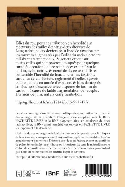 Édict du roy, portant attribution en heredité aux receveurs des tailles des vingt-deux dioceses de Languedoc, de dix deniers pour livre de taxation sur les sommes augmentées par l'edict du mois d'octobre mil six cents trente-deux, & generalement sur toutes celles qui s'imposeront cy-aprés pour quelque cause & occasion que ce soit, fors & excepté sur le taillon, ayde, octroy, & creuë de six cents mil livres; ensemble l'heredité de leurs anciennes taxations casuelles de dix deniers, reglement d'icelles, sçavoir quatre deniers en année d'exercice, & trois deniers és années hors d'exercice, avec dispense de fournir de caution, à cause de ladite augmentation de recepte . Du mois de juin, mil six cents trente-trois Date de l'édition originale: 1633 Le présent ouvrage s'inscrit dans une politique de conservation patrimoniale des ouvrages de la littérature Française mise en place avec la BNF. HACHETTE LIVRE et la BNF proposent ainsi un catalogue de titres indisponibles, la BNF ayant numérisé ces oeuvres et HACHETTE LIVRE les imprimant à la demande. Certains de ces ouvrages reflètent des courants de pensée caractéristiques de leur époque, mais qui seraient aujourd'hui jugés condamnables. Ils n'en appartiennent pas moins à l'histoire des idées en France et sont susceptibles de présenter un intérêt scientifique ou historique. Le sens de notre démarche éditoriale consiste ainsi à permettre l'accès à ces oeuvres sans pour autant que nous en cautionnions en aucune façon le contenu. Pour plus d'informations, rendez-vous sur www.hachettebnf.fr