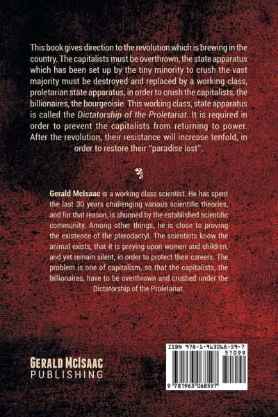 This book gives direction to the revolution which is brewing in the country. The capitalists must be overthrown, the state apparatus which has been set up by the tiny minority to crush the vast majority must be destroyed and replaced by a working class, proletarian state apparatus, in order to crush the capitalists, the billionaires, the bourgeoisie. This working class, state apparatus is called the Dictatorship of the Proletariat. It is required in order to prevent the capitalists from returning to power. After the revolution, their resistance will increase tenfold, in order to restore their ''paradise lost''.
