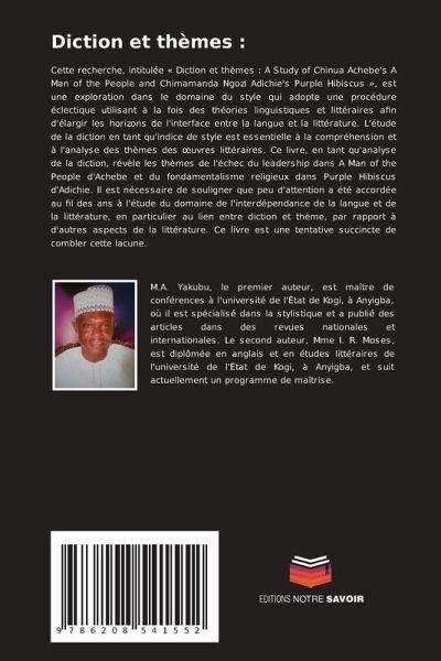 Cette recherche, intitulée « Diction et thèmes : A Study of Chinua Achebe's A Man of the People and Chimamanda Ngozi Adichie's Purple Hibiscus », est une exploration dans le domaine du style qui adopte une procédure éclectique utilisant à la fois des théories linguistiques et littéraires afin d'élargir les horizons de l'interface entre la langue et la littérature. L'étude de la diction en tant qu'indice de style est essentielle à la compréhension et à l'analyse des thèmes des oeuvres littéraires. Ce livre, en tant qu'analyse de la diction, révèle les thèmes de l'échec du leadership dans A Man of the People d'Achebe et du fondamentalisme religieux dans Purple Hibiscus d'Adichie. Il est nécessaire de souligner que peu d'attention a été accordée au fil des ans à l'étude du domaine de l'interdépendance de la langue et de la littérature, en particulier au lien entre diction et thème, par rapport à d'autres aspects de la littérature. Ce livre est une tentative succincte de combler cette lacune.