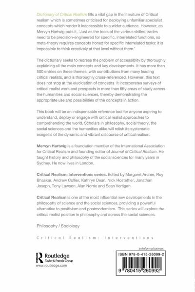 Dictionary of Critical Realism fulfils a vital gap in the literature, Critical Realism is often criticised for being too opaque and deploying too much jargon, thereby making the concepts inaccessible for a wider audience. However, as Hartwig puts it 'Just as the tools of the various skilled trades need to be precision-engineered for specific, interrelated functions, so meta-theory requires concepts honed for specific interrelated tasks: it is impossible to think creatively at that level without them.'