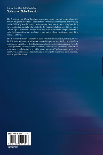 The dictionary furthers the ideals of cosmopolitanism: solidarity, equality, respect for difference and concern with what human beings- and specifically patients - have in common, regardless of their backgrounds, hometowns, religions, gender, etc. Global problems such as pandemic diseases, disasters, lack of care and medication, homelessness and displacement call for global responses.This book demonstrates that a moral vision of global health is necessary and it helps to quickly understand the basic ideas of global bioethics.