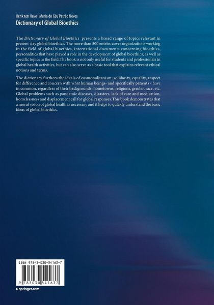The dictionary furthers the ideals of cosmopolitanism: solidarity, equality, respect for difference and concern with what human beings- and specifically patients - have in common, regardless of their backgrounds, hometowns, religions, gender, etc. Global problems such as pandemic diseases, disasters, lack of care and medication, homelessness and displacement call for global responses.This book demonstrates that a moral vision of global health is necessary and it helps to quickly understand the basic ideas of global bioethics.
