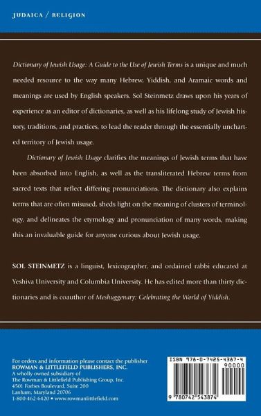 Dictionary of Jewish Usage: A Guide to the Use of Jewish Terms is a unique and much needed guide to the way many Hebrew, Yiddish, and Aramaic words and meanings are used by English speakers. Sol Steinmetz draws upon his years of dictionary editorial experience, as well as his lifelong study of Jewish history, traditions, and practices, to guide the reader through the essentially uncharted territory of Jewish usage.