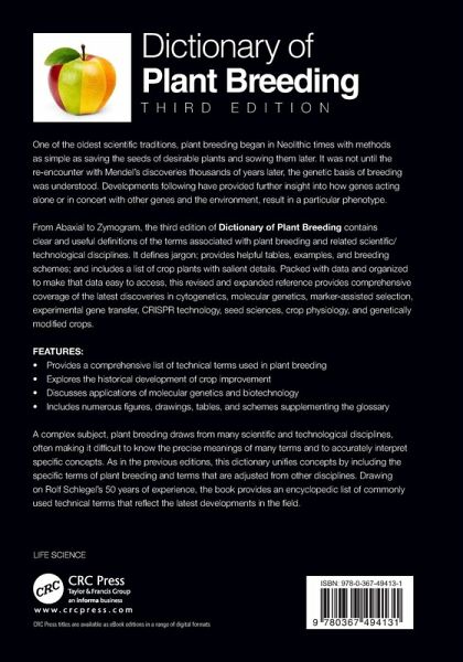 One of the oldest scientific traditions, plant breeding began in Neolithic times with methods as simple as saving the seeds of desirable plants and sowing them later. It was not until the re-encounter with Mendel's discoveries thousands of years later, the genetic basis of breeding was understood. Developments following have provided further insight into how genes acting alone or in concert with other genes and the environment, result in a particular phenotype. From Abaxial to Zymogram, the third edition of Dictionary of Plant Breeding contains clear and useful definitions of the terms associated with plant breeding and related scientific/technological disciplines. It defines jargon; provides helpful tables, examples, and breeding schemes; and includes a list of crop plants with salient details. Packed with data and organized to make that data easy to access, this revised and expanded reference provides comprehensive coverage of the latest discoveries in cytogenetics, molecular genetics, marker-assisted selection, experimental gene transfer, CRISPR technology, seed sciences, crop physiology, and genetically modified crops. Features: Provides a comprehensive list of technical terms used in plant breeding Explores the historical development of crop improvement Discusses applications of molecular genetics and biotechnology Includes numerous figures, drawings, tables, and schemes supplementing the glossary A complex subject, plant breeding draws from many scientific and technological disciplines, often making it difficult to know the precise meanings of many terms and to accurately interpret specific concepts. As in the previous editions, this dictionary unifies concepts by including the specific terms of plant breeding and terms that are adjusted from other disciplines. Drawing on Rolf Schlegel's 50 years of experience, the book provides an encyclopedic list of commonly used technical terms that reflect the latest developments in the field.
