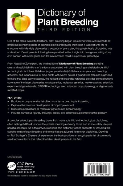 From Abaxial to Zymogram, the third edition of Dictionary of Plant Breeding contains clear and useful definitions of the terms associated with plant breeding and related scientific/technological disciplines. It defines jargon; provides helpful tables, examples, and breeding schemes; and includes a list of crop plants with salient details. Packed with data and organized to make that data easy to access, this revised and expanded reference provides comprehensive coverage of the latest discoveries in cytogenetics, molecular genetics, marker-assisted selection, experimental gene transfer, CRISPR technology, seed sciences, crop physiology, and genetically modified crops.