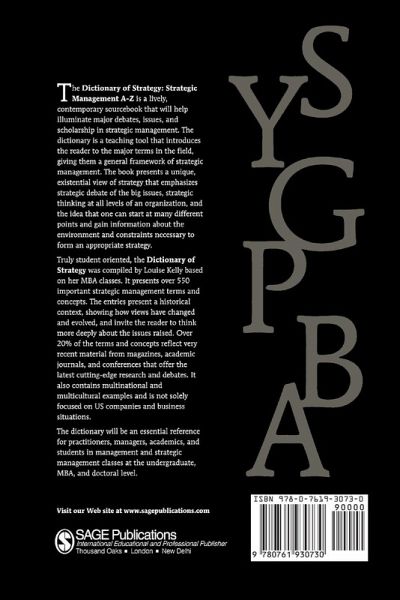 The Dictionary of Strategy: Strategic Management A-Z is a lively, contemporary sourcebook that will help illuminate major debates, issues, and scholarship in strategic management. The dictionary is a teaching tool that introduces the reader to the major terms in the field, giving them a general framework of strategic management. The book presents a unique, existential view of strategy that emphasizes strategic debate of the big issues, strategic thinking at all levels of an organization, and the idea that that one can start at many different points and gain information about the environment and constraints necessary to form an appropriate strategy.