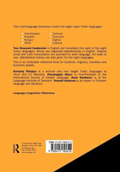 2000 headwords in English are translated into each of the eight Turkic languages. Words are organized both alphabetically and topically. Original script and Latin transliteration are provided for each language. For ease of use, alphabetical indices are also given for the eight languages.