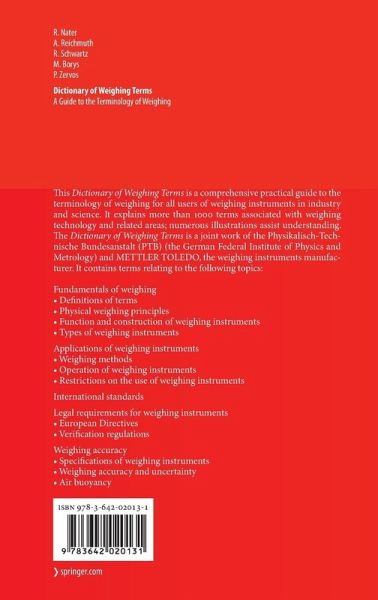 "Written by scientists from Germany's national metrology institute, the Physikalisch-Technische Bundesanstalt, and employees of Mettler-Toledo International, this dictionary features definitions for more than 1,000 terms related to weight and mass, along with hundreds of full-color photographs, illustrations, and diagrams. It fills a useful niche, as no dictionaries of this type have been published recently. ... In this volume, most definitions are clear, concise, and easily understandable by nonscientists. ... References are included ... . Summing Up: Recommended. Graduate students, researchers/faculty, and professionals/practitioners." (J. A. Murphy, Choice, Vol. 47 (11), July, 2010)