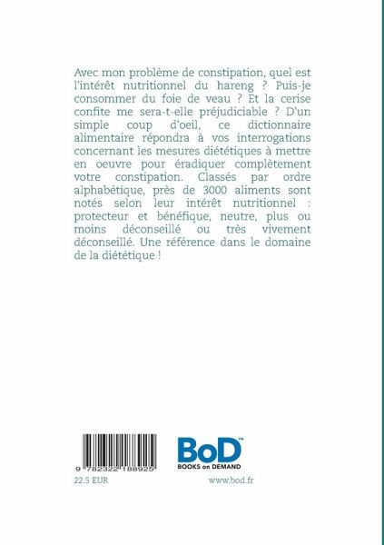 Avec mon problème de constipation, quel est l'intérêt nutritionnel du hareng ? Puis-je consommer du foie de veau ? Et la cerise confite me sera-t-elle préjudiciable ? D'un simple coup d'oeil, ce dictionnaire alimentaire répondra à vos interrogations concernant les mesures diététiques à mettre en oeuvre pour éradiquer complètement votre constipation. Classés par ordre alphabétique, près de 3000 aliments sont notés selon leur intérêt nutritionnel : protecteur et bénéfique, neutre, plus ou moins déconseillé ou très vivement déconseillé. Une référence dans le domaine de la diététique !