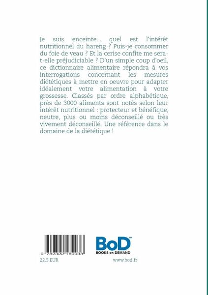 Je suis enceinte... quel est l'intérêt nutritionnel du hareng ? Puis-je consommer du foie de veau ? Et la cerise confite me sera-t-elle préjudiciable ? D'un simple coup d'oeil, ce dictionnaire alimentaire répondra à vos interrogations concernant les mesures diététiques à mettre en oeuvre pour adapter idéalement votre alimentation à votre grossesse. Classés par ordre alphabétique, près de 3000 aliments sont notés selon leur intérêt nutritionnel : protecteur et bénéfique, neutre, plus ou moins déconseillé ou très vivement déconseillé. Une référence dans le domaine de la diététique !