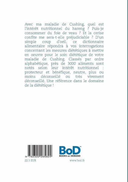 Avec ma maladie de Cushing, quel est l'intérêt nutritionnel du hareng ? Puis-je consommer du foie de veau ? Et la cerise confite me sera-t-elle préjudiciable ? D'un simple coup d'oeil, ce dictionnaire alimentaire répondra à vos interrogations concernant les mesures diététiques à mettre en oeuvre pour le soin diététique de votre maladie de Cushing. Classés par ordre alphabétique, près de 3000 aliments sont notés selon leur intérêt nutritionnel : protecteur et bénéfique, neutre, plus ou moins déconseillé ou très vivement déconseillé. Une référence dans le domaine de la diététique !