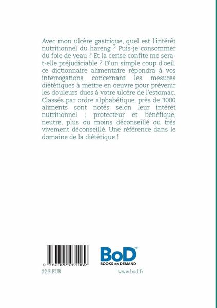 Avec mon ulcère gastrique, quel est l'intérêt nutritionnel du hareng ? Puis-je consommer du foie de veau ? Et la cerise confite me sera-t-elle préjudiciable ? D'un simple coup d'oeil, ce dictionnaire alimentaire répondra à vos interrogations concernant les mesures diététiques à mettre en oeuvre pour prévenir les douleurs dues à votre ulcère de l'estomac. Classés par ordre alphabétique, près de 3000 aliments sont notés selon leur intérêt nutritionnel : protecteur et bénéfique, neutre, plus ou moins déconseillé ou très vivement déconseillé. Une référence dans le domaine de la diététique !