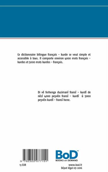 Ce dictionnaire bilingue français - kurde se veut simple et accessible à tous. Il comporte environ 4000 mots français - kurdes et 5 000 mots kurdes - français.