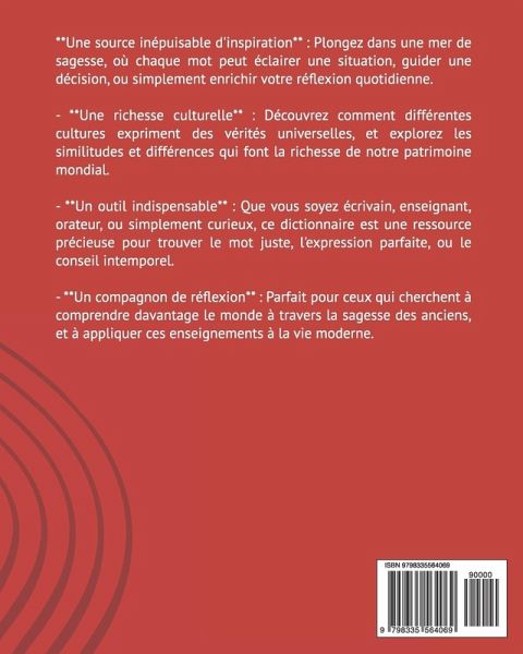 Bienvenue dans le *Dictionnaire de Proverbes Universels, Tome 2*, une continuation de notre exploration des trésors de sagesse partagés par les cultures du monde entier. Ce tome élargit encore la collection, en rassemblant des proverbes qui, tout comme dans le premier volume, sont soigneusement classés par ordre alphabétique pour une consultation facile et enrichissante. Ce recueil va au-delà des simples mots; il est un miroir des valeurs, des expériences, et des vérités qui résonnent à travers les âges et les continents. Chaque proverbe a été sélectionné pour son pouvoir d'évocation, sa pertinence intemporelle, et sa capacité à capturer l'essence de la condition humaine. Comme pour le premier tome, nous avons inclus des indications sur les origines culturelles de chaque proverbe, ainsi que des variantes régionales ou linguistiques, afin de vous offrir une perspective profonde sur la diversité et l'universalité de la pensée humaine. - **Une source inépuisable d'inspiration**: Plongez dans une mer de sagesse, où chaque mot peut éclairer une situation, guider une décision, ou simplement enrichir votre réflexion quotidienne. - **Une richesse culturelle**: Découvrez comment différentes cultures expriment des vérités universelles, et explorez les similitudes et différences qui font la richesse de notre patrimoine mondial. - **Un outil indispensable**: Que vous soyez écrivain, enseignant, orateur, ou simplement curieux, ce dictionnaire est une ressource précieuse pour trouver le mot juste, l'expression parfaite, ou le conseil intemporel. - **Un compagnon de réflexion**: Parfait pour ceux qui cherchent à comprendre davantage le monde à travers la sagesse des anciens, et à appliquer ces enseignements à la vie moderne. **Pour qui est ce livre ?** Ce dictionnaire est destiné à tous ceux qui sont passionnés par les mots, intrigués par la culture, ou avides de sagesse. Que vous cherchiez à enrichir votre discours, à approfondir votre connaissance des proverbes, ou simplement à trouver des phrases qui résonnent avec votre expérience, ce tome est une mine d'or pour l'esprit et le coeur. **Un voyage à travers la sagesse mondiale** Avec le *Dictionnaire de Proverbes Universels, Tome 2*, continuez votre voyage à travers les expressions qui ont façonné les esprits, guidé les vies, et éclairé les âmes à travers l'histoire. Ce recueil vous ouvre une fenêtre sur l'immensité et la profondeur de l'expérience humaine, à travers des paroles qui transcendent le temps et les frontières. **Laissez-vous emporter par ce voyage littéraire, où chaque page vous offrira une nouvelle perspective, une nouvelle réflexion, et peut-être même un nouvel aperçu de vous-même.**